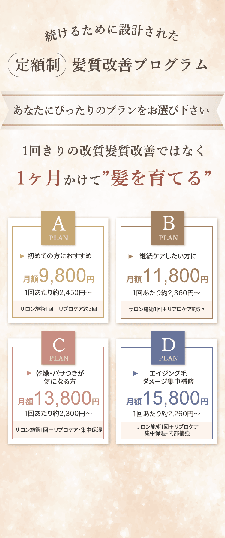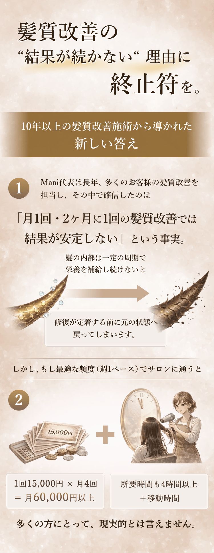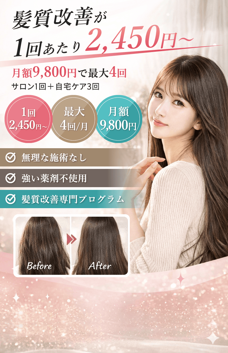 その分、サロン品質の髪質改善を、続けやすい価格で実現できる仕組みになっています。
