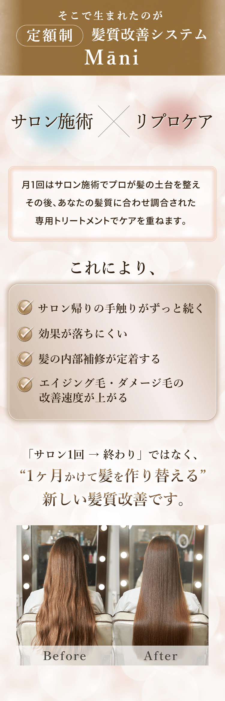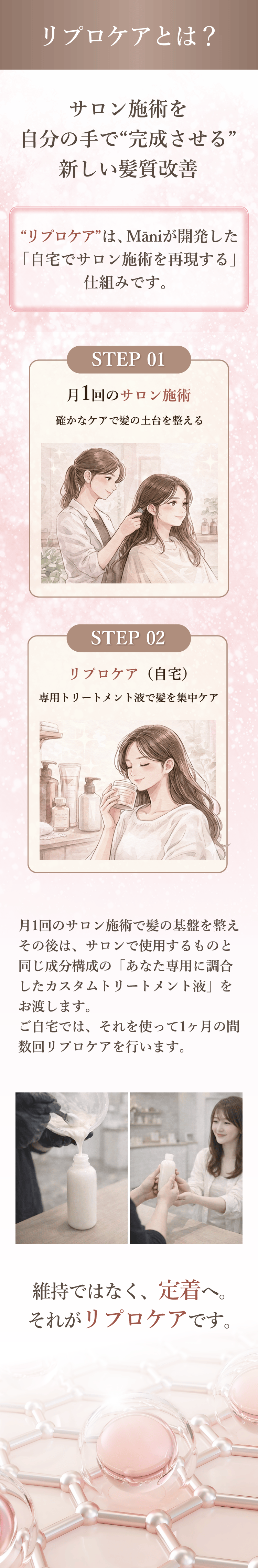 サロン施術とリプロケアを組み合わせることで、継続的に髪質改善を進めていきます。 -